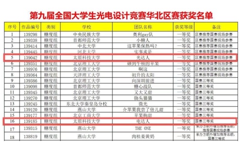 由我校太阳集团城娱8722教师邱选兵、李传亮及郭古青指导的“光达人”和“电达人”两支学生队伍代表我校参加了本次竞赛。经过方案展示和实物现场PK的激烈角逐。由伍和鹏、韩锴锴、王虎组成的“电达人”队伍获得华北赛区一等奖;由马成聪、刘博、智晓龙、王进组成的“光达人”队伍获得华北赛区一等奖并晋级全国总决赛。