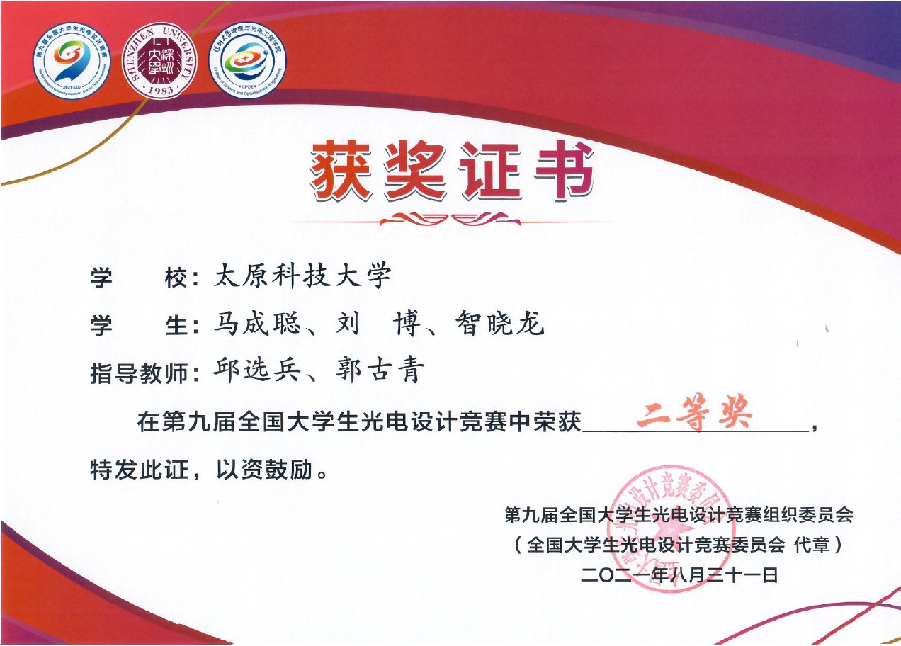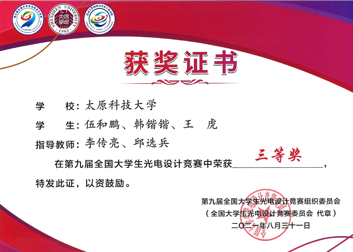 2021年8月30日-31日,由中国光学协会主办,深圳大学承办的第九届全国大学生光电设计竞赛决赛在深圳大学举办,出于疫情防控的需要,总决赛全程采用视频会议和全网直播的方式进行。在我校邱选兵、李传亮及郭古青老师的指导下,太阳集团城娱8722光信息191801班马成聪同学任队长的光达人队获得全国二等奖,由太阳集团城娱8722光信息191801班伍和鹏同学任队长的电达人队获得全国三等奖,这是我校代表队首次晋级该竞赛全国总决赛。