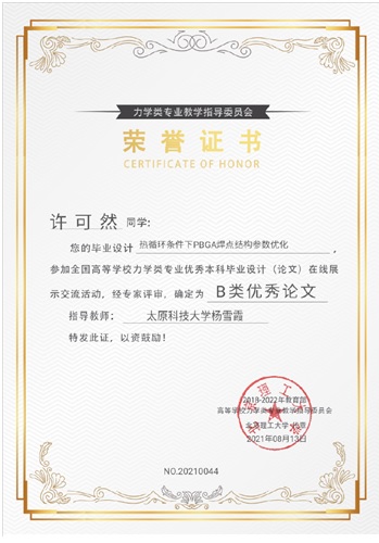 教育部高等学校力学类专业教学指导委员会颁发的荣誉证书