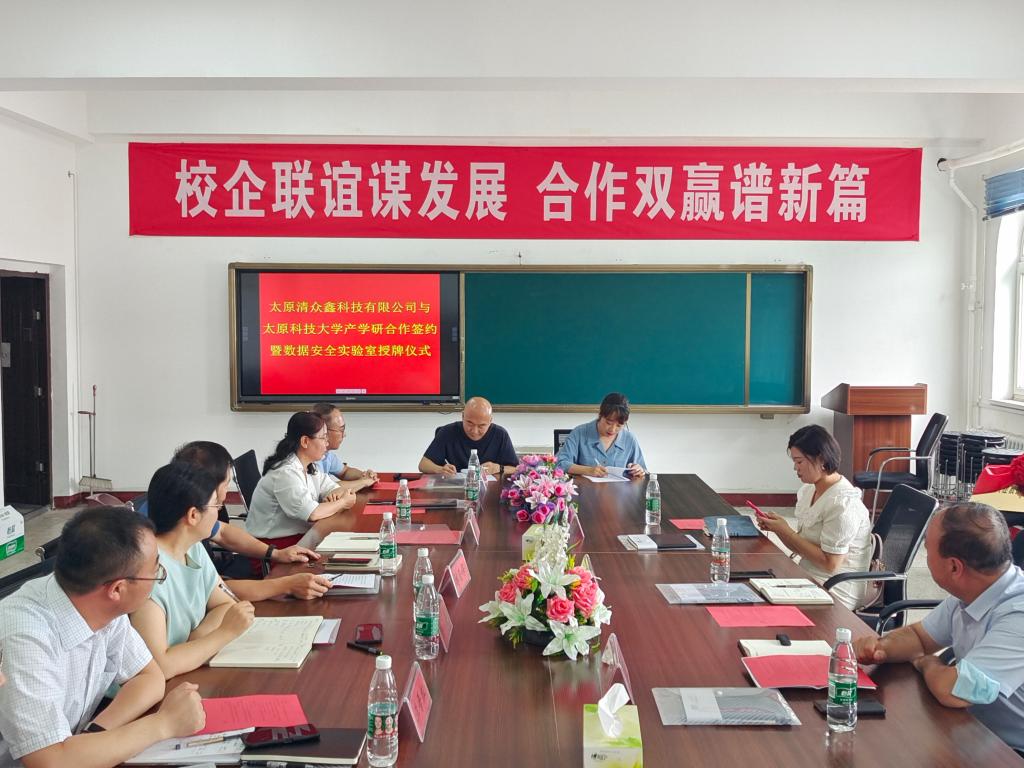 8月15日上午,太原清众鑫科技有限公司与我院的产学研合作暨校企共建数据安全实验室揭牌仪式在我院701会议室举行。太原清众鑫科技有限公司总经理、副总经理等一行四人、学院领导班子成员和部分骨干教师出席了签约仪式,仪式由学院副院长杨斌鑫主持。