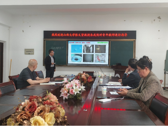 为推动学院青年教师队伍建设,促进教学质量提升,同时帮助青年教师备赛青教赛,4月12日下午,应校工会和学院的邀请,山西大学张义贤教授在学院701会议室对参加青教赛的青年教师孟帅及学院近三年入职的青年教师进行备赛指导。校工会副主席于少娟教授参加指导,由副院长杨斌鑫主持,学院近三年入职的青年教师聆听了指导。