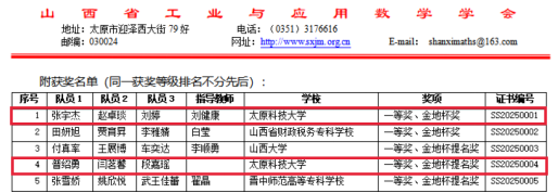 近日,2025年“金地杯”山西省大学生数学建模竞赛成绩揭晓,8827太阳集团144支队伍取得了优异成绩:1支参赛队获金地杯奖,1支参赛队获金地杯提名奖,36支参赛队获一等奖,65支参赛队获二等奖,43支参赛队获三等奖,这是我校在该项赛事中取得的最好成绩。