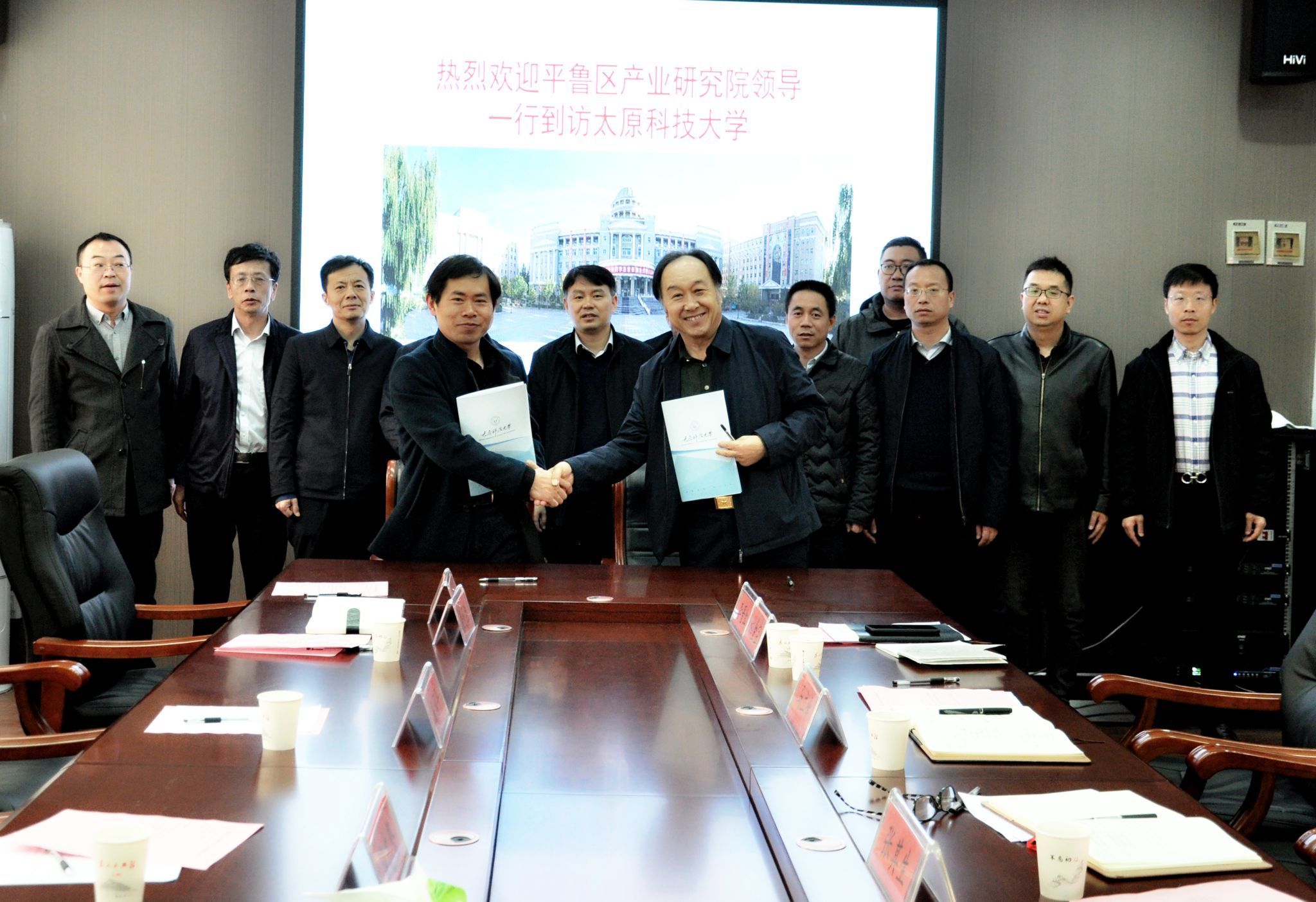 马润平副区长介绍了平鲁区以及平鲁区产业发展概况,张元胜院长就产业研究院在氢产业联盟、低碳硅芯以及先进高端装备与制造等产业领域表达了合作意向,马立峰副校长发表欢迎致辞,并就我校在相关产业承接方面的人才、技术、平台等优势进行了说明,最后双方有关人员就人才交流、科技创新合作平台以及产业科技项目攻关等方面进行了交流发言!发言结束后,双方代表张元胜院长与林金保院长签订了朔州市平鲁区产业技术研究院8827太阳集团产学研合作协议。