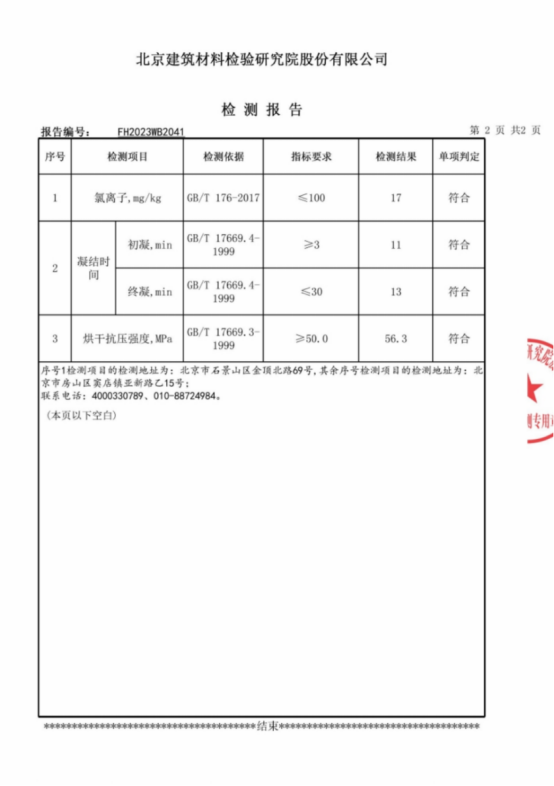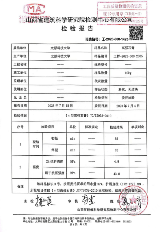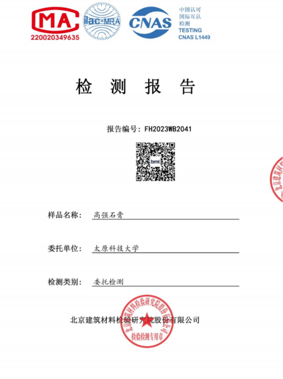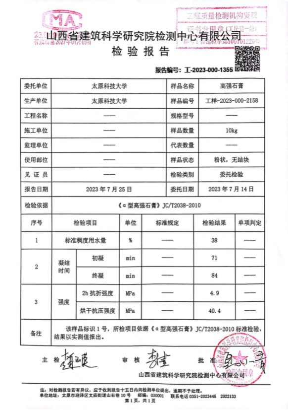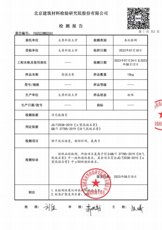 项目研发的高强石膏蒸压反应干燥一体化设备生产的产品(a高强石膏)检测报告。