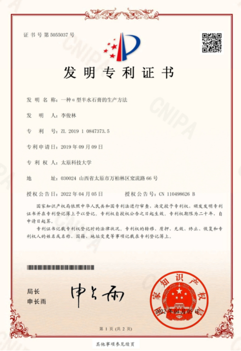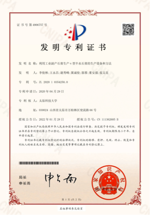 (2)一种α型半水石膏的生产方法,ZL 2019 1 0847373.5, 2022.4.5