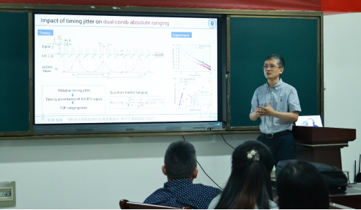 在报告中,宋教授以光频梳为主题,以飞秒激光时间特性的三个典型应用为主线,围绕基于异步光采样的时间抖动表征、超高时间精度的电控光学采样技术、超高精度的时间探针等方面展开深入细致的讲解。随后,师生围绕光频梳实验系统搭建的关键技术问题进行了交流探讨,分析了超高精度的时间探针在多孤子动力学中的应用等问题,更好地致力于学生的成长和光频梳方向的发展。