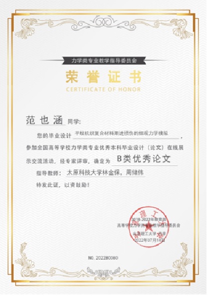 教育部高等学校力学类专业教学指导委员会颁发的荣誉证书