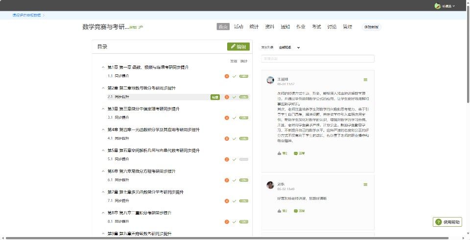 考研高等数学线上、线下混合式课程由教学副院长杨斌鑫教授负责建设。杨院长根据多年的教学经验,编写了考研高等数学基础阶段和强化阶段的讲义。基础阶段学生通过“学习通”加入课程并在线上进行学习,内容包括考研要求、讲课视频、电子讲义等内容,为考研打下良好的基础。课程采用手写板书的形式,边讲边写,方便学生跟上思路,同时锻炼学生的逻辑思维能力。强化阶段在线下进行,通过选修课的方式面向全校学生,也欢迎没有选课而有考研需求的同学前往听课。强化阶段以专题形式讲解重点难点,如微分中值定理证明中值问题、等式与不等式的证明、函数方程的求解等,帮助同学们掌握解题诀窍、冲刺高分。根据反馈,考研混合式课程的模式深受学生好评。