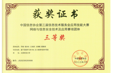 近日,中国信息协会公示了第三届信息技术服务业应用技能大赛获奖名单,我院数据安全实验室团队在“网络与信息安全技术及应用大赛”中经过初赛与答辩,最终荣获三等奖,也是省内唯一获奖高校。