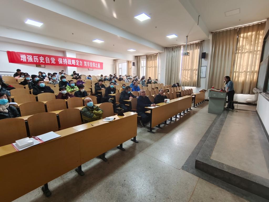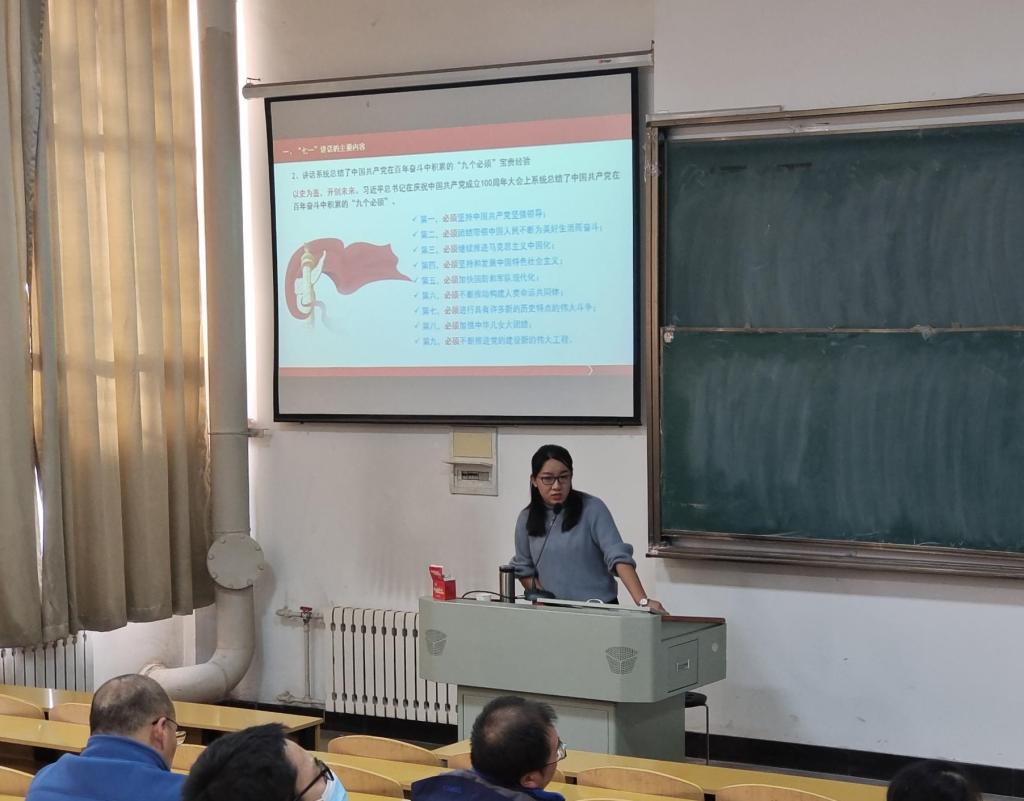 为深入学习贯彻习近平总书记“七一”重要讲话精神,2021年11月10日15时,太阳集团城娱8722党委邀请校党史学习教育宣讲团张慧婷老师为我院师生开展了题为“中国共产党百年奋斗的九大历史经验”的党史学习教育宣讲会。学院领导班子成员、组织员、部分教师代表和学生党员共计60余人参加了会议。会议由学院党委副书记杨耀田主持。