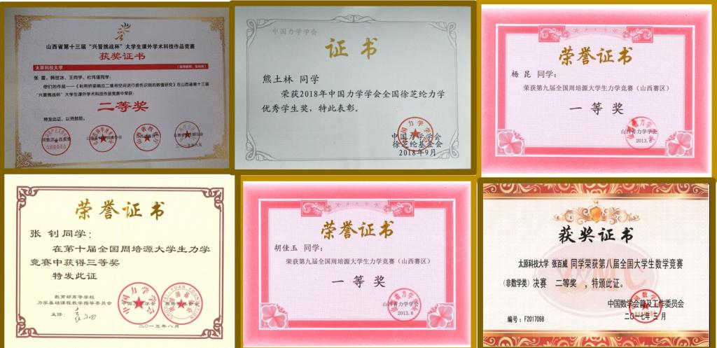 秉承“理实交融,博学卓思”的教育理念,通过全国周培源大学生力学竞赛、大学生创新创业实践、学科科研、校企合作等多方向培育和引导,近年来学生主持完成国家级大学生创新创业训练项目2项,山西省高等学校大学生创新创业训练项目(重点)8项,校级UIT16项,发表学术论文13篇。2014年获第13届“兴晋挑战杯”大学生课外学术科技作品竞赛二等奖1项;2015年第六届全国大学生数学竞赛中,工程力学专业学生获非专业组省一等奖1人,省二等奖2人;2017年第八届全国大学生数学竞赛中,工程力学专业13级学生张百威获非专业组国家二等奖。2021年第十三届全国周培源大学生力学竞赛中8名学生获省级一等奖(国家级三等奖),12名学生获省级二等奖,15名学生获省级三等奖。
